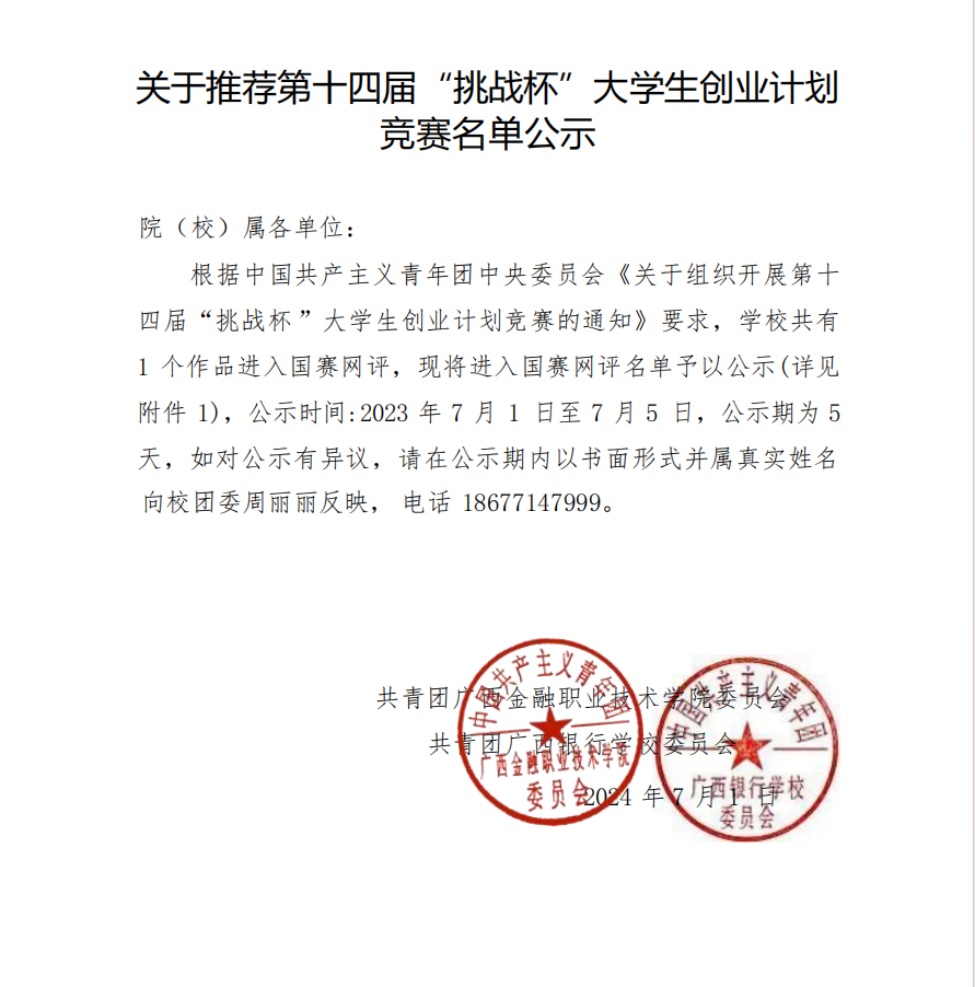 关于推荐第十四届“挑战杯”大学生创业计划竞赛名单公示