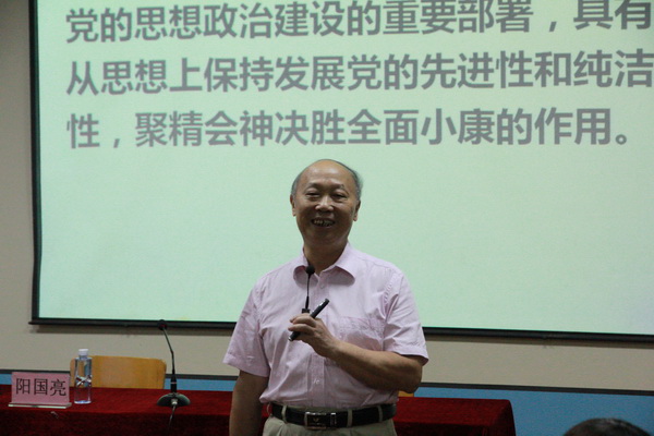 会上,阳国亮教授从三个方面对“两学一做”学习教育作了深入解析。一是深刻领会开展“两学一做”学习教育的重大意义。“两学一做”学习教育是面向全体党员深化党内教育新的重要实践,具有不断巩固全党团结统一,凝聚全党力量,决胜全面小康的作用;是加强党的思想建设的重要部署,具有从思想上保持发展党的先进性和纯洁性,聚精会神决胜全面小康的作用。二是准确理解“两学一做”学习教育的目标、内容和形式。突出强调学习《中国共产党纪律处分条例》的重要性。三是切实把握“两学一做”学习教育的内在要求。要坚持理想信念的“原教旨”教育,坚定积极向上的共产主义信仰;确立执政为民的思想理念,构建向善向上的优良政治生态;做到“不敢腐、不能腐、不想腐”。
