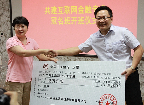 最后,王宋亭董事长代表亚太富邦投资管理公司向互联网金融班捐赠3万元作为助学金,整个开班仪式在热烈的气氛中结束。