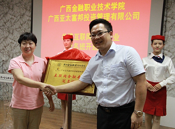 2015年9月6日晚19点30分,kaiyun官方登录入口与广西亚太富邦投资管理有限公司合作的冠名班——互联网金融专业班开班仪式在电教一楼隆重举行。在40名互联网金融班同学的热烈掌声中,迎来了出席开班仪式的合作双方领导,有kaiyun官方登录入口沈立君院长、刘华政副书记,金融系、投资保险系、计算机系、学工部门的相关领导及教师代表,以及广西亚太富邦投资管理公司的王宋亭董事长、郭爱国总经理、崔洪亮副总经理,以及公司各职能部门的领导一行人。