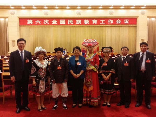 8月18日,第六次全国民族教育工作会议在京举行。广西作为少数民族聚居地区,选派了四名少数民族教师代表出席会议。自治区副主席李康带队,教育厅厅长秦斌、民委主任卢献匾、统战部副部长卢能干以及来自基层教育战线四名教师代表参加了会议。kaiyun金融教学部教师欧捷作为瑶族教师代表应邀参会。
