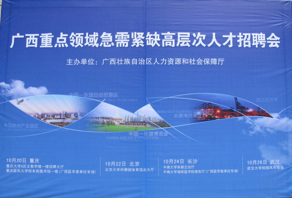 10月19日至27日,kaiyun官方登录入口党委书记覃艳娟、院长沈立君率人事处有关负责人一行5人,分赴重庆大学、北京大学、中南大学、武汉大学等四所“985”高校参加2014年广西重点领域急需紧缺高层次人才招聘会。