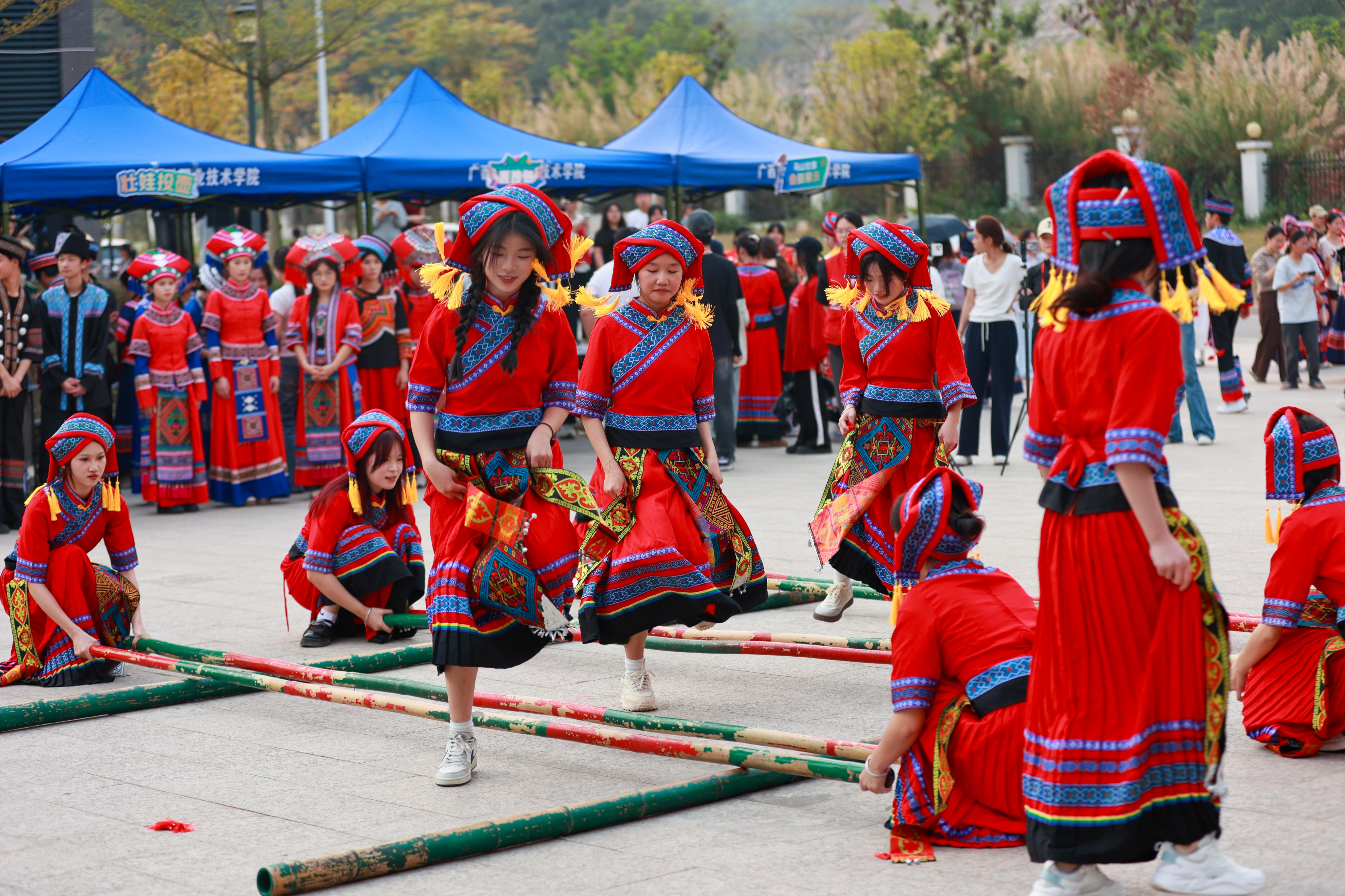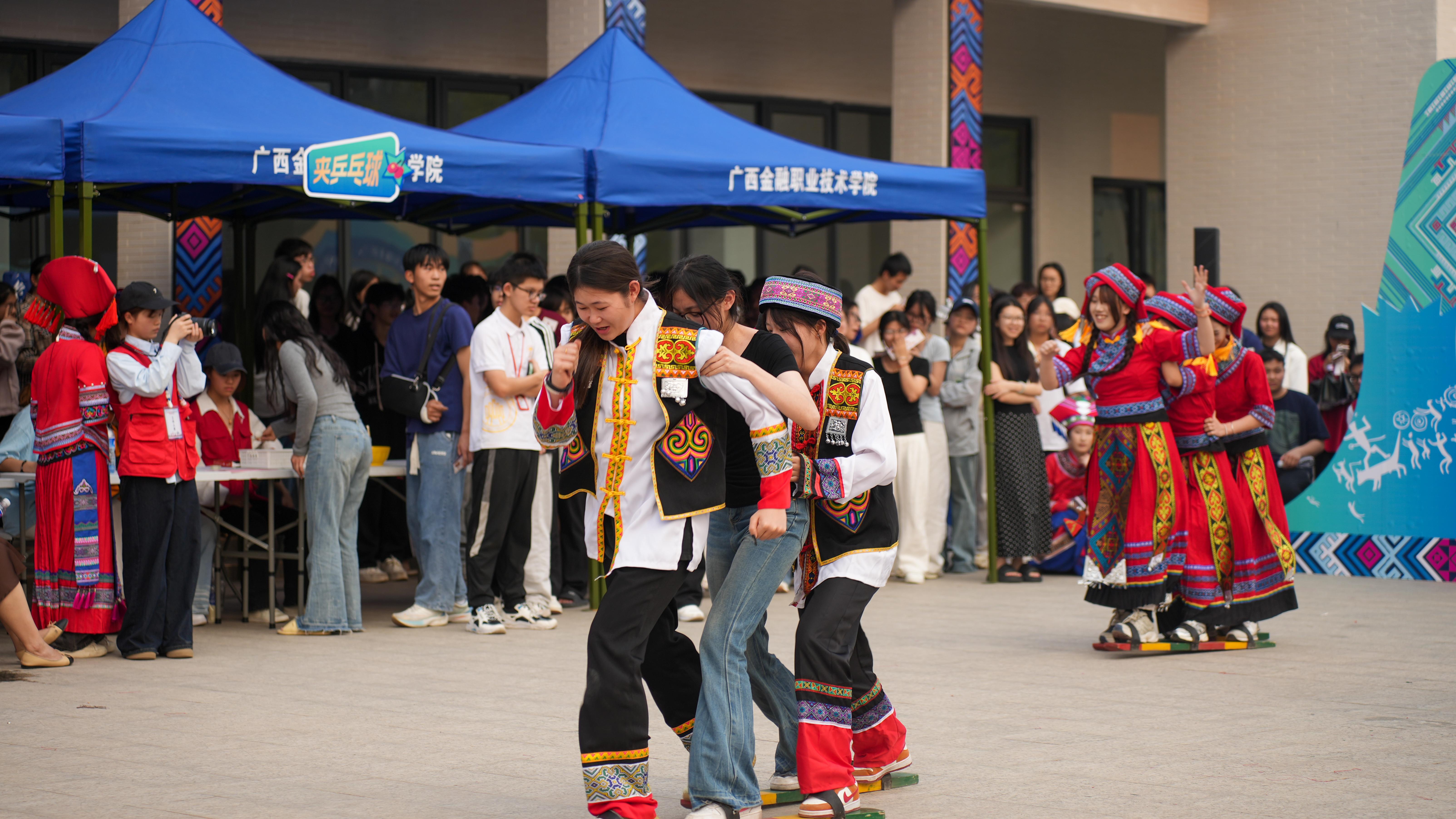 活动现场,“唱响三月三”对歌、竹竿舞等节目精彩上演,背篓接绣球、板鞋竞速接力、非遗美食和漆扇绘锦绣体验等特色项目趣味横生,以“体验+竞技”多元形式呈现中华韵味、民族风情、广西特色与金院风采的深度融合,为校园增添了一抹亮丽的文化底色。