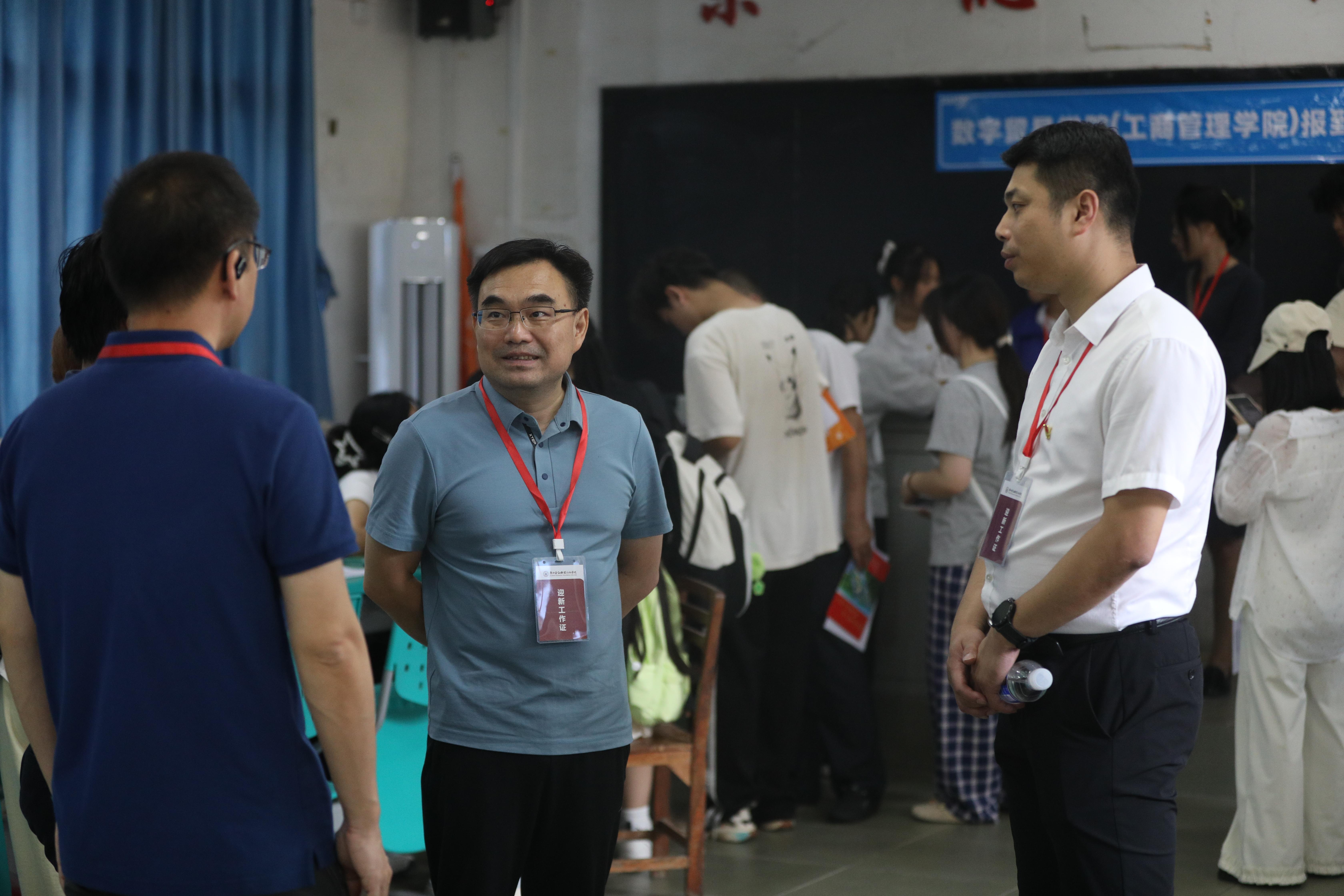 为确保迎新各项工作顺利开展,学校领导现场指导工作,亲切慰问迎新志愿者和工作人员,并与前来报到的新生热情交流。