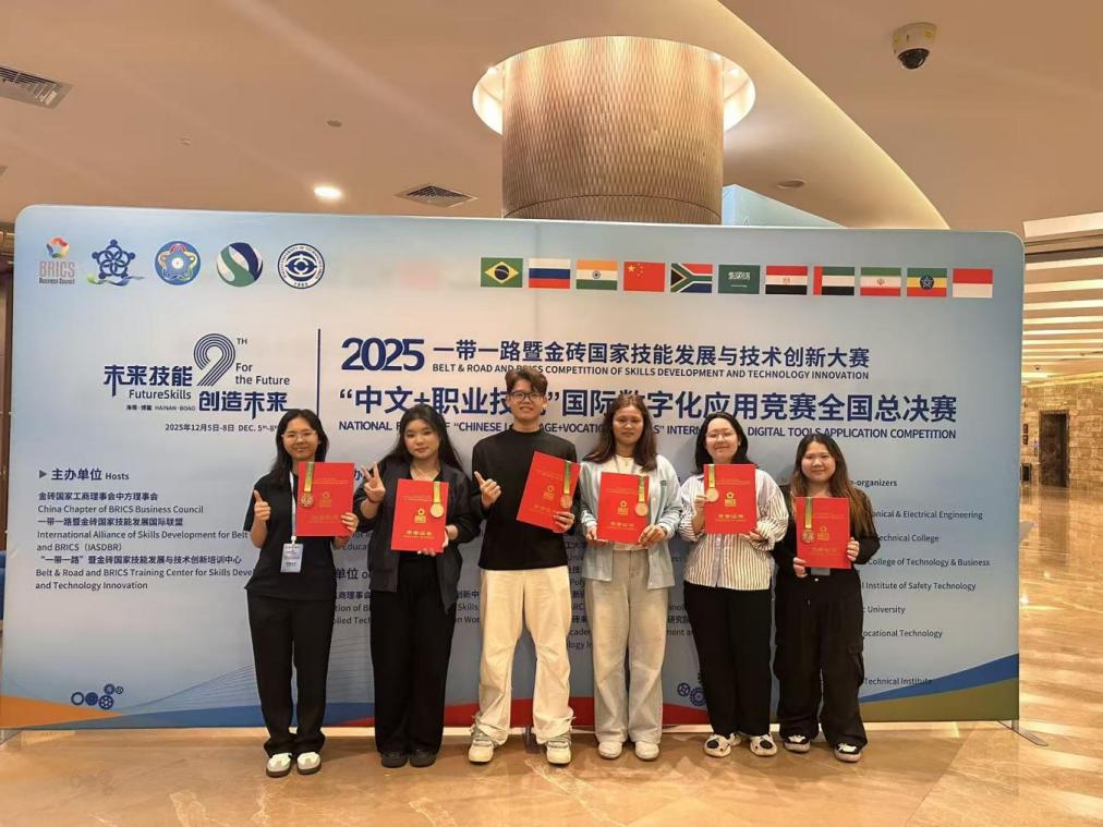 12月5日至8日,2025“一带一路”暨金砖国家技能发展与技术创新大赛“中文+职业技能”国际数字化应用竞赛全国总决赛在海南博鳌亚洲教育国际会议中心落幕。该赛事由金砖国家工商理事会中方理事会、中国发明协会、教育部中外人文交流中心等单位联合举办,是金砖国家技能合作核心平台。本次总决赛吸引全国近500名选手参加,kaiyun选派阮克亮(越南)、阮秋清(越南)、郑吉梅(柬埔寨)、陈千丽(柬埔寨)、范芳草(越南)、杨如意(柬埔寨)6名国际学生参赛,最终6名选手均获三等奖,创下kaiyun国际学生参与国家级技能赛事的最佳成绩,彰显了kaiyun国际教育的扎实成效。