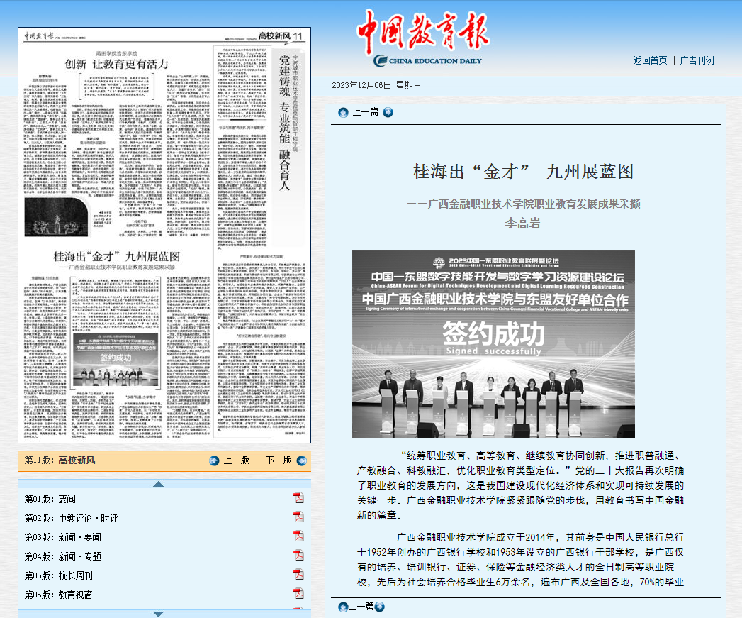 12月6日,《中国教育报》以“桂海出‘金才’九州展蓝图”为题,从“党建铸魂,引领发展”、“‘双高’筑基,办学育才”两个方面,对学校近年来在职业教育发展方面的主要做法及经验进行了总结和阐释。