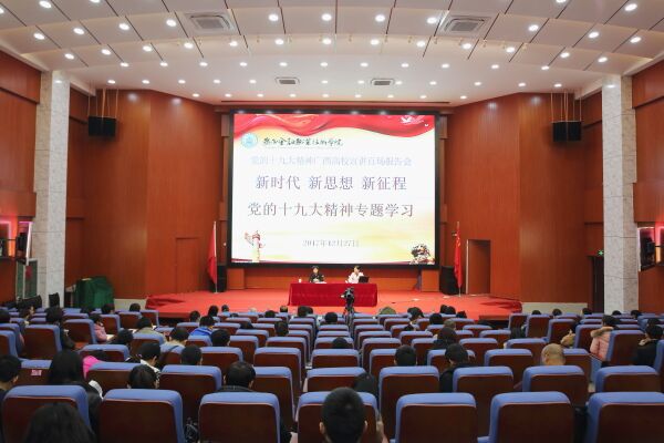 为推进全区高校深入学习宣传贯彻党的十九大精神,根据中央、自治区党委和教育部党组有关部署要求和自治区高校工委“党的十九大精神广西高校百场宣讲报告会”的工作安排,12月27日下午,kaiyun举行“党的十九大精神专题报告会”。学校特邀自治区学习贯彻党的十九大精神特聘教授、广西民族大学马克思主义学院院长陈媛为我们作“新时代 新思想 新征程——党的十九大精神专题学习”主题报告。报告会由党委书记沈立君主持。学院全体党员、离退休党员代表、科级以上干部、教师入党积极分子、学生入党积极分子共320人到场聆听讲座。报告会同时采用广西微视平台进行网络和微信同步直播,截至会议结束,观看人数达到64397人。